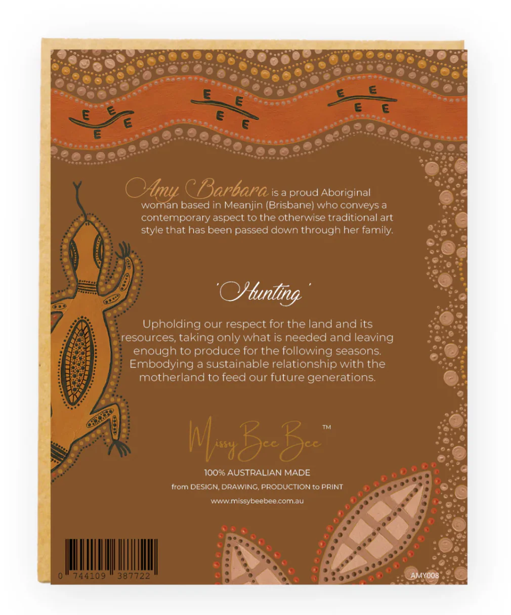 The Hunting Card from the Missy Bee Bee collection by Indigenous artist Amy Barbara beautifully reflects the traditional practice and cultural importance of hunting in Aboriginal life. With its earthy tones and intricate design, this everyday card is a meaningful way to connect through art and story.
