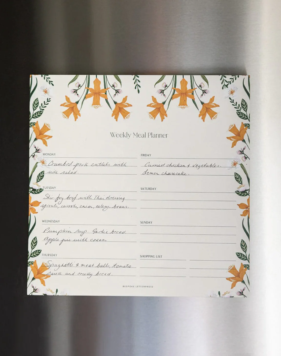 Plan your week in style with our beautifully illustrated Daffodil Meal Planner Notepad. Featuring elegant floral artwork by the Bespoke Letterpress design team, this thoughtfully designed planner makes organising your meals a visual delight.