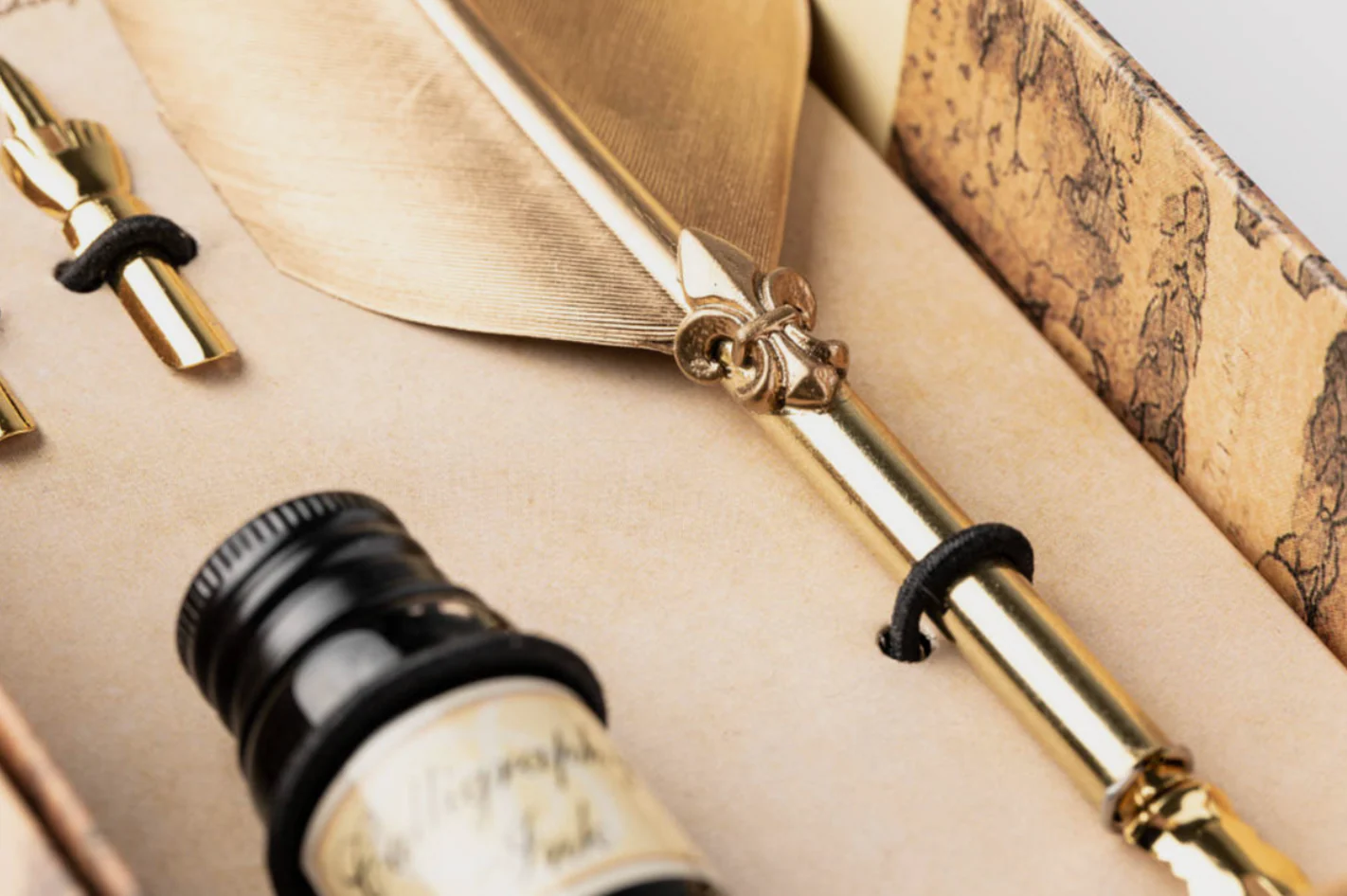 Experience the elegance of traditional calligraphy with the Gold Feather Pen Writing Set, featuring a luxurious gold feather, fleur-de-lis-decorated tip, and three gold nibs. Handcrafted in Italy, this exquisite set combines artistry, function, and timeless design — perfect for calligraphy enthusiasts and stationery lovers.